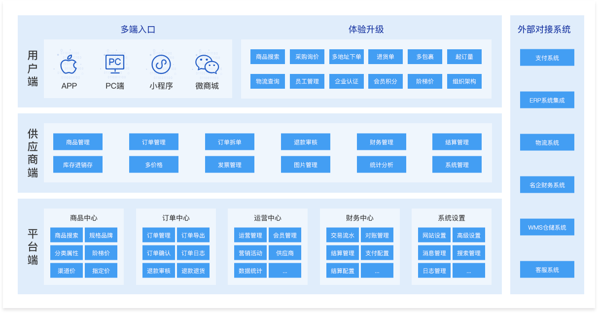 基于長期服務(wù)大型企業(yè)所積累的B2B電商平臺開發(fā)經(jīng)驗,規(guī)劃出滿足廣泛需求的B2B電商系統(tǒng)